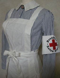 今夏新入荷しました『DRKナース服』。 「着てみたいけど、実際の着心地はどうなの?」と思う女性の方もいらっしゃるかもしれません。 そういう訳で私、ジーナが実際着用してみた感想を書きます。 今後購入を考えていらっしゃる方のお役に立てればと思います♪ まずは気になる服のサイズ! サイズはMサイズ・Lサイズの通常2サイズをご用意しております。Sサイズもありますが、こちらは特注になりますのでご注意を。 私の場合Lかな~と思ったのですが(標準よりややぽっちゃり体型なので)、 Mでも入りそうだったので一応着用してみました。 すると、Mサイズでもややゆったりめに出来上がっていましたので私のような 体型のものでも楽々着られました!!ちなみには私の身長は156㎝なので、スカート丈がやや長め のような気もしますが、それでもふくらはぎがさっと隠れる程度です。 短いソックスが良く似合う感じですね。 襟も角襟と丸襟の二種類あって、どちらもすごく素敵です。私は丸襟をチョイスしました。 襟だけでもイメージが大分変わりますから、お好みで♪ エプロンは最初着付けがほんの少しだけ大変ですが、完成させたらあとはそれを気崩さないように 脱げば、次回から紐を通す手間が省けます。私みたいな不精さんにオススメ・・・・・・。 隠しポケットも袋が大きく以外に物が入ります。 前で結ぶ紐は、真ん中に結んでもよし、脇に結んでも可愛いです。 肝心の「動きやすさ」は、抜群! 腕周りもゆったりしていますので、腕を上げたり曲げたりしても窮屈じゃあありません! ワンピースが「ちょっと大きいかな?」と思っても、エプロンの紐を結んで調節すれば大丈夫♪ エプロンが上手く隠してくれて、着痩せ効果も!? 私としてはとても大満足な一着となりました♪ 戦場に咲く一輪の花のごとき天使、DRKナース。 セット内容 看護婦服 本体 替襟(丸&角、各1枚) ナースキャップ エプロン DRK赤十字腕章(刺繍) DRK赤十字襟章(ピンバッチ) 計 6点セット 詳しい内容・価格は下記URLをクリック↓ http://www.kampfbataillon.com/shopping/index.html